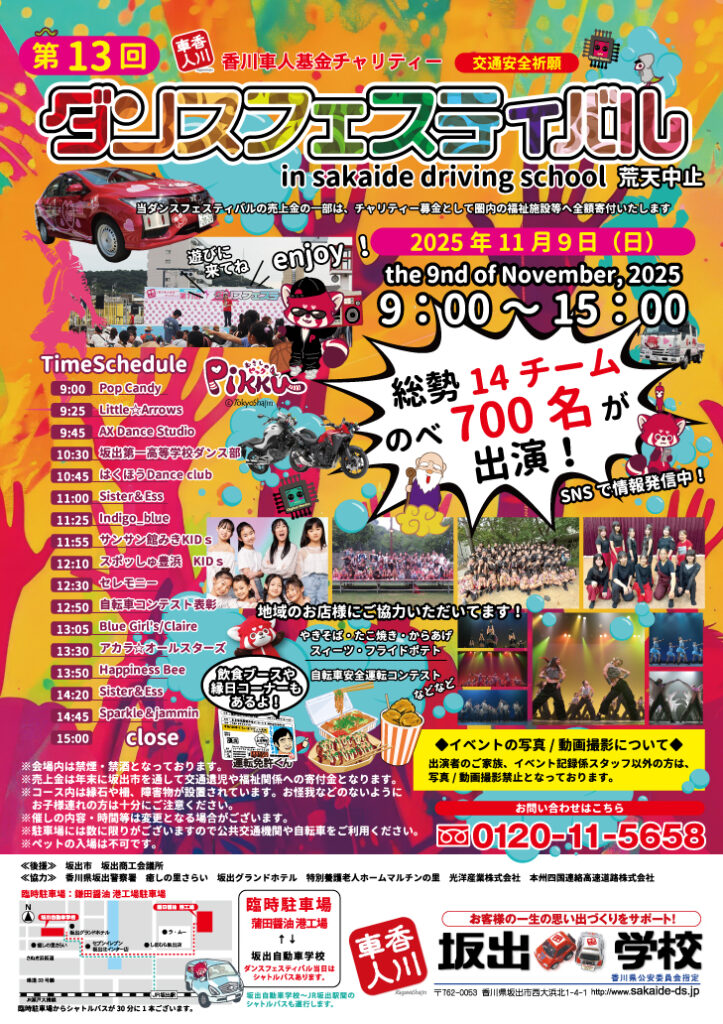 2025年11月9日(日)に開催を予定しておりました「香川車人基金チャリティー交通安全祈願 第13回ダンスフェスティバル」につきまして、天候不順が予想されるため、安全を最優先に考慮し、開催日を下記の通り延期させていただくこととなりました。
