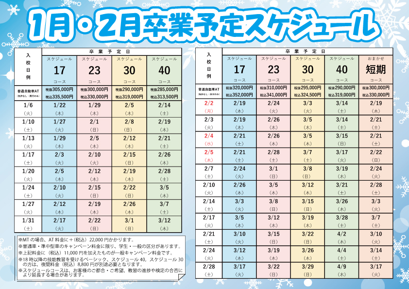 ※スケジュールコースは、お客様のご都合・ご希望、教習の進捗や検定の合否により延長する場合がございます。